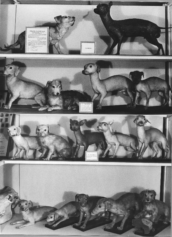 Historisches Foto der Museumsvitrine mit Dermoplastiken aus der Nackthundstudie. Oben: weiblicher behaarter Hund (l.) und männlicher haarloser Hund; darunter ihre Nachkommen (F1- und F2-Generation). Quelle: © Archiv Phyletisches Museum, Jena (idw)
