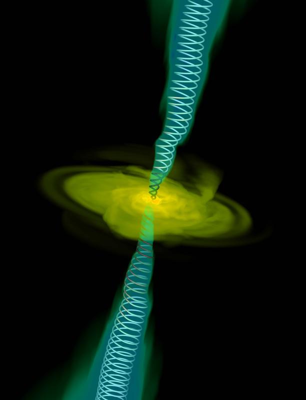 Computersimulation von Gas, das in Richtung eines zentralen Schwarzen Lochs einströmt. Nach oben und Quelle: Bildrechte: Alexander Tchekhovskoy (LBNL) (idw)