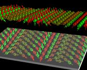 Die magnetischen Momente der einzelnen Mangan-Atome bilden eine gedrehte dreidimensionale Struktur, eine so genannte Spinspirale. In der Abbildung repräsentieren die Pfeile schematisch die magnetischen Momente der Mangan-Atome, die so genannten "Spins", die man sich als winzige Kompassnadeln vorstellen kann. Oben sieht man den einen Drehsinn, unten im Spiegelbild den anderen. © SPM-Gruppe von Prof. R. Wiesendanger, Universität Hamburg