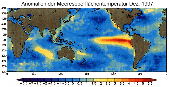 Anomalie der Meeresoberflächentemperatur (°C), beobachtet im Dezember 1997 während des letzten starken El Niños (Quelle: NCEP, NOAA)
