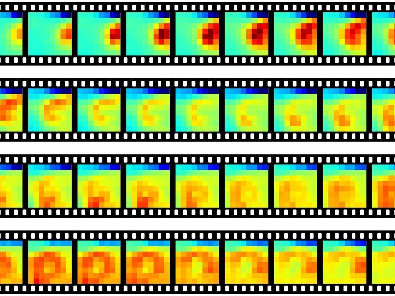 Durch das Vogelhirn von links oben nach rechts unten wandernde Nervenzell-Aktivität. Jedes Bild zeig Quelle: MPI f. Ornithologie/ Rattenborg (idw)