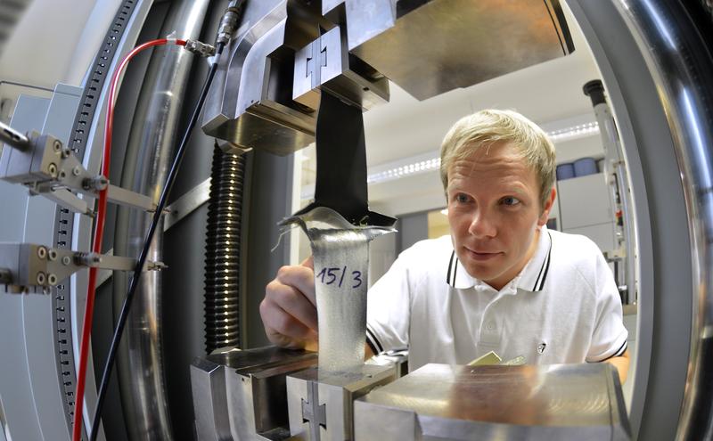 Der Rettungsschlauch besteht aus einer inneren und einer äußeren Gewebekonstruktion, deren Verbindung stark beansprucht wird. Ob die verwendeten Materialien den hohen Belastungen standhalten können, testet Lars Jahreis von der Professur Fördertechnik im Prüflabor der TU Chemnitz. Quelle: Foto: TU Chemnitz/Wolfgang Schmidt (idw)