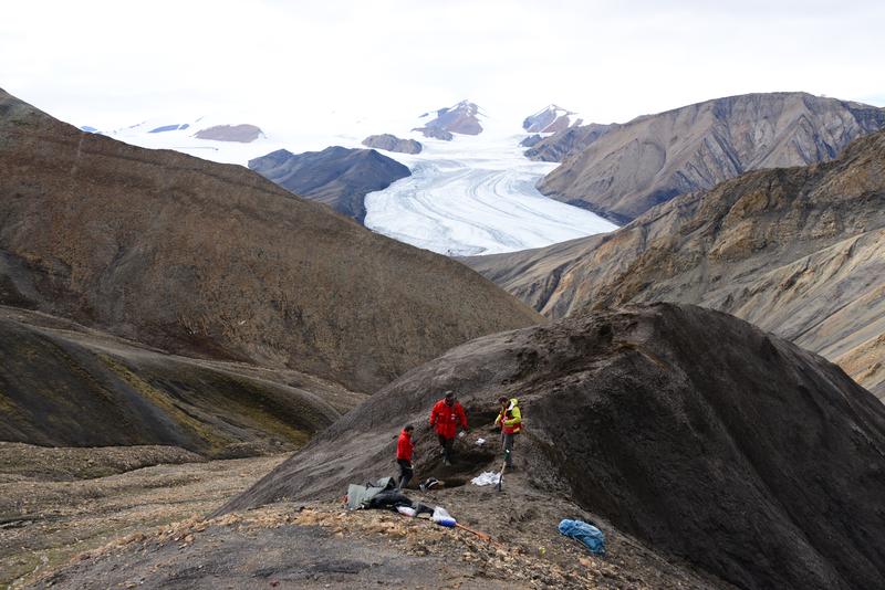 Beprobung kreidezeitlicher Sedimente am Lost Hammer Diapir auf Axel Heiberg Island. Quelle: © Claudia Schröder-Adams (idw)