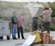 So simulieren die Vulkanforscher Eruptionen und pyroklastische Ströme: Die Kanone wurde über einen Einfülltrichter soeben mit heißer Vulkanasche beschickt und steht kurz vor der Eruption. Links im Bild der Elektroofen, in dem die Asche aufgeheizt wurde. Die Forscher sind (von links): Roberto Sulpizio, Franco Balenzano, Pierfrancesco Dellino. Foto: Bernd Zimanowski
