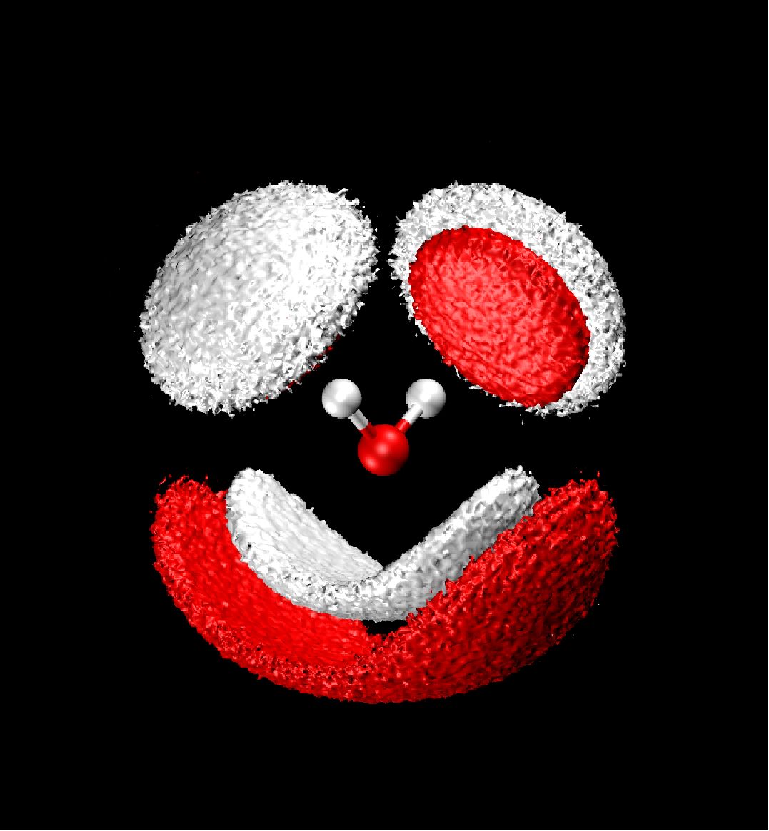 Modell eines symmetrischen, vierfach koordinierten Wassermoleküls (Sauerstoff rot und Wasserstoff weiß) Abb.: Thomas D. Kühne