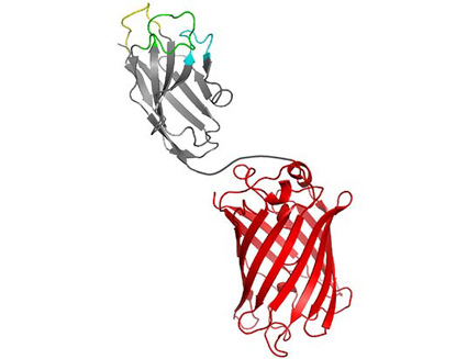 Die antigenbindende Domäne des einzelkettigen Antikörpers von Alpakas und Kamelen wird mit einem fluoreszierenden Protein als Marker (rot) fusioniert, um einen Chromobody, eine leuchtende Nanosonde, für die Forschung an lebenden Zellen zu erzeugen. Quelle: LMU