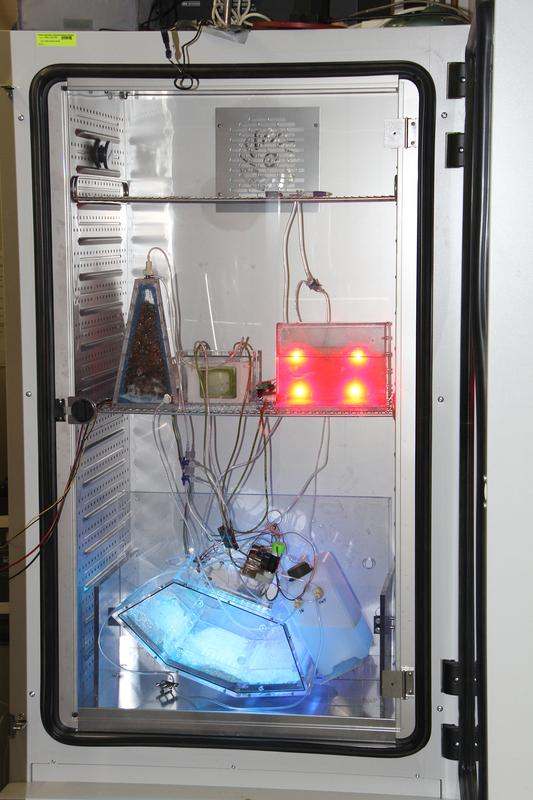 In einem Wärmeschrank testen die Zellbiologen bereits das Ökosystem: Unten das Gewächshaus, oben links der Filter, daneben der Wassertank und der Tank für die Alge Euglena gracilis.