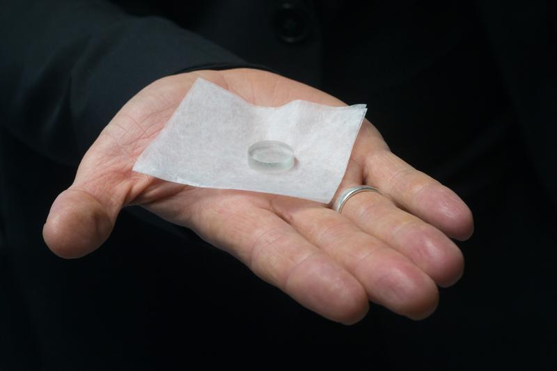Eine Scheibe, die Thorium-229-Kerne enthält. Sie sollen in künftigen Kern-Uhren den Takt angeben. Quelle: TU Wien (idw)