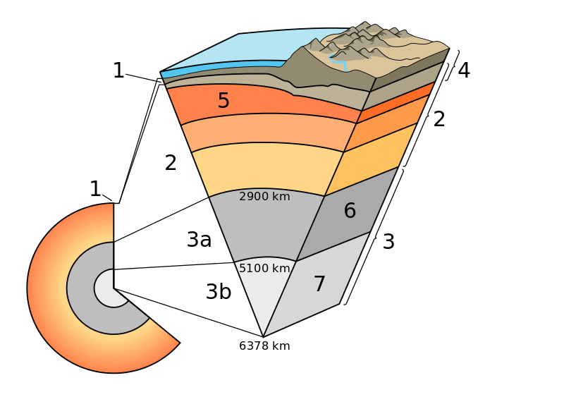 Innerer Aufbau der ErdeSchichten nach chemischer Zusammensetzung:1 Erdkruste, 2 Erdmantel, 3 Erdkern(3a äußerer Erdkern, 3b innerer Erdkern)Schichten nach mechanischen Eigenschaften:4 Lithosphäre, 5 Asthenosphäre6 äußerer Erdkern, 7 innerer Erdkern