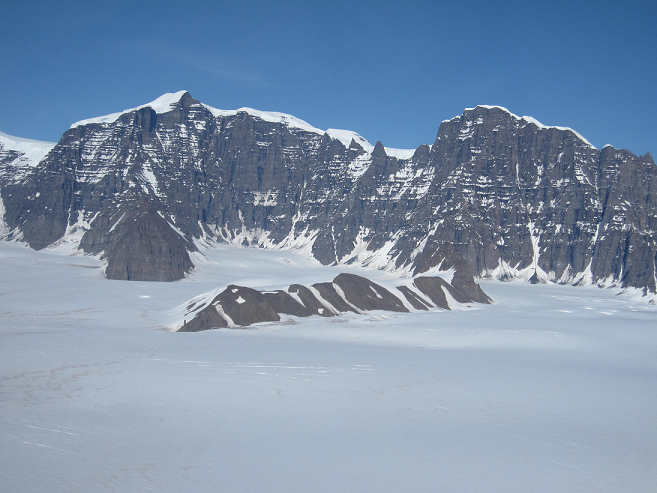 Die Watkins-Berge im südlichen Ostgrönland mit dem höchsten Gipfel Grönlands, Gunbjørn Fjeld (3,7 km über NN) im Hintergrund. Blick von ca. 2 km über Meereshöhe zum 1,5 km hohen Watkins-Steilabbruch, der sich in Basalte einschneidet, die am Übergang vom Paleozän zum Eozän vor 56 Mio. Jahren ausbrachen, damals nahezu auf Meereshöhe.