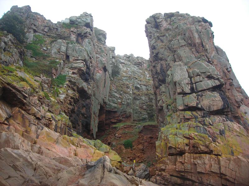 Ansicht der Fundstelle La Cotte de St Brelade auf der Insel Jersey, Großbritannien. Ein Großteil der Knochen stammt aus den Ausgrabungen unter dem Granitbogen links im Bild ist. Quelle: Foto: Geoff Smith, MONREPOS (idw)