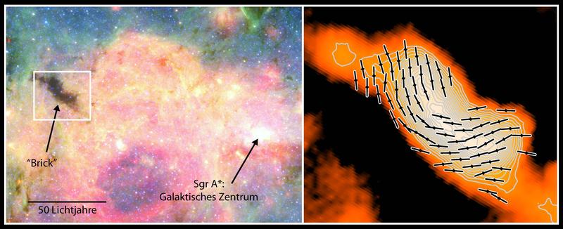 Kosmische Dunkelwolke "Brick" (Ziegelstein) in der Nähe des Galaktischen Zentrums. Quelle: T. Pillai & J. Kauffmann, auf der Grundlage von GLIMPSE- & MIPSGAL-Bildern vom Spitzer-Satelliten (NASA / JPL–Caltech / Univ. of Wisconsin) und dem Hertz–Empfänger am CSO (J. Dotson) (idw)