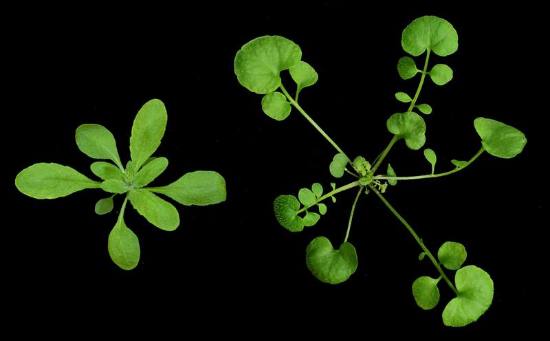 Die Ackerschmalwand besitzt ganzrandige Blätter (links), das Behaarte Schaumkraut dagegen Fiederblät Quelle: MPI f. Pflanzenzüchtungsforschung/ Lempe (idw)