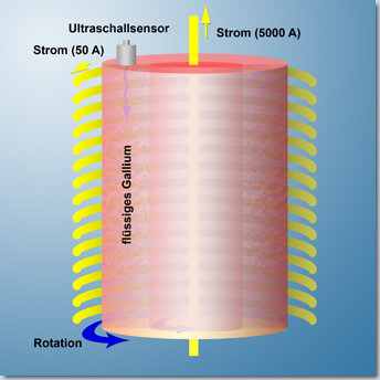 Schematischer Aufbau von PROMISE. Das flüssige Gallium befindet sich zwischen zwei Zylindern mit gemeinsamer Achse. Innerer und äußerer Zylinder rotieren mit unterschiedlichen Umlaufzeiten. Ultraschallsensoren messen die vertikale Geschwindigkeit des flüssigen Metalls. Bild: AIP/FZR