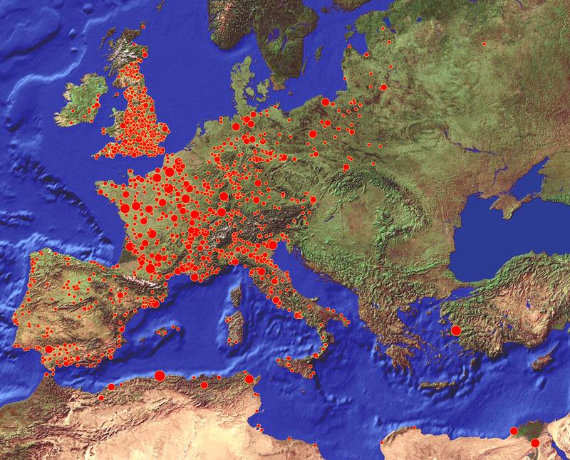 Karte mit 7'711 Pest-Ausbrüchen, die sich zwischen 1347 und 1900 AD in Europa ereigneten. Die Daten basieren auf einer im Jahr 1976 veröffentlichten Publikation. Quelle: Grafik: Christian Ginzler (WSL) (idw)