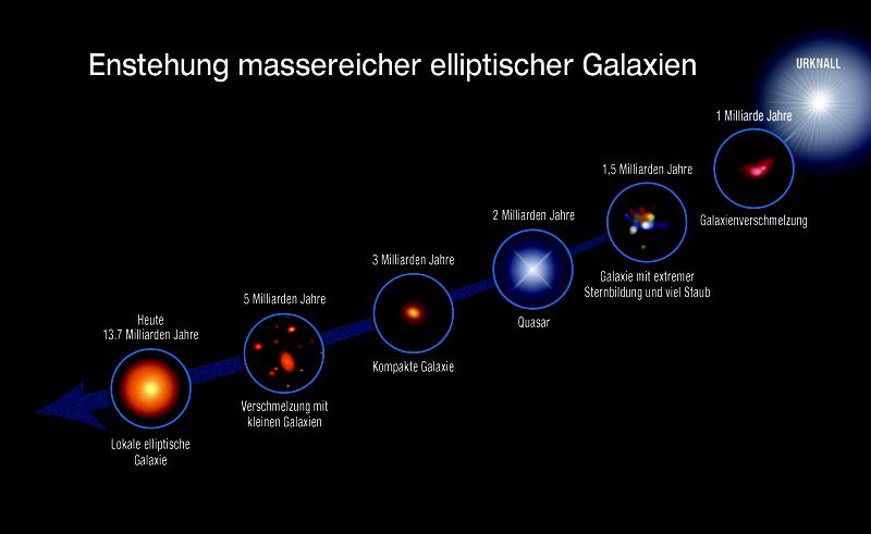 Die Grafik zeigt die evolutionäre Sequenz des Wachstums massereicher elliptischer Galaxien über 13 M Quelle: (c) Bildquelle: NASA, ESA, S. Toft (Niels Bohr Institut Kopenhagen), A. Karim (Argelander-Institut für Astronomie) und A. Feild (Space Telescope Science Institute) (idw)