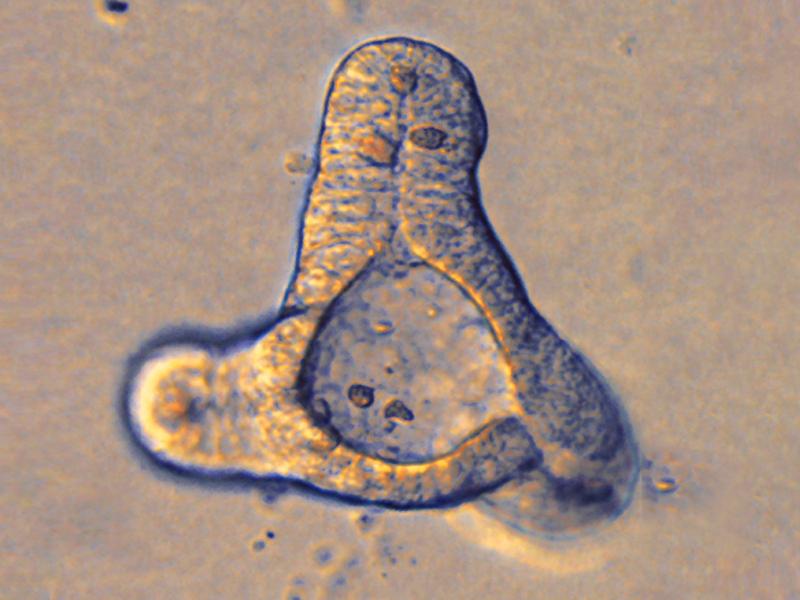 Viertelmillimeter große Organoide wie dieser eingefärbte Mini-Darm zeigen essentielle Funktionen eines echten Darms. Quelle: (Foto: TUM/ Zietek) (idw)