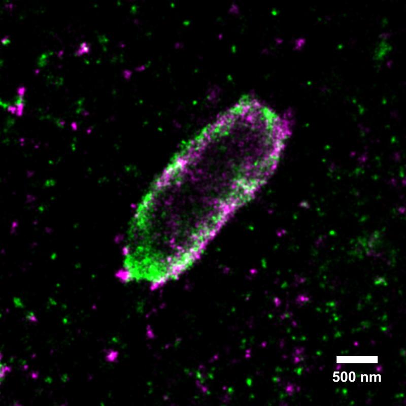 Ein Salmonellen-Bakterium in einer menschlichen Zelle, umgeben von einem Mantel aus verschiedenartige Ubiquitin-Ketten. Quelle: Mike Heilemann/Ivan Dikic (idw)
