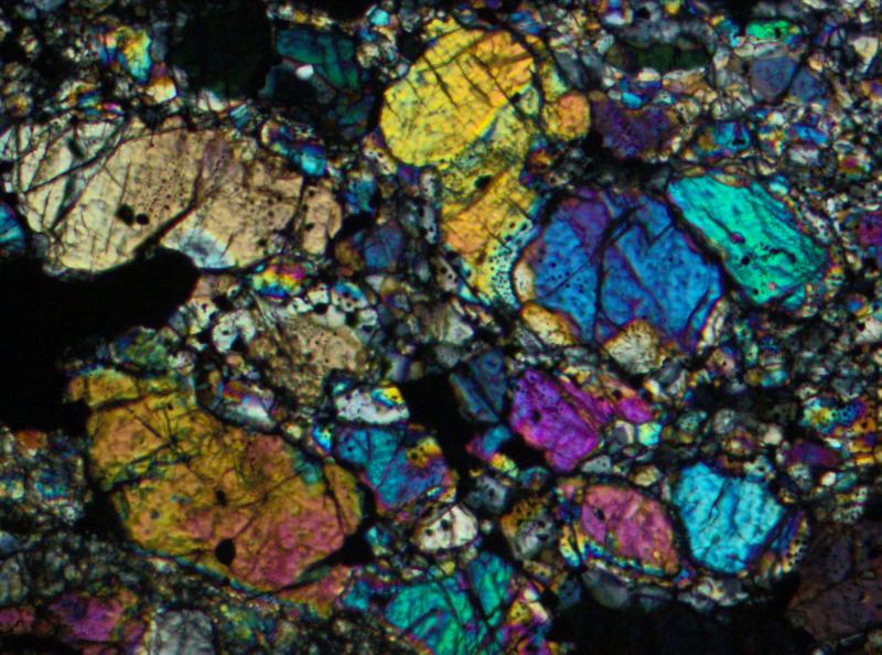 So sieht das Innere des Meteoriten unter dem Polarisationsmikroskop aus. Quelle: Foto: WWU/Addi Bischoff (idw)