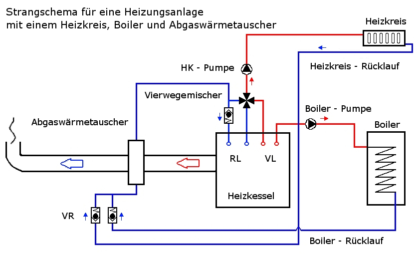 Hydraulisches Strangschema für eine Heizungsanlage mit einem Heizkreis, Boiler und Abgaswärmetauscher