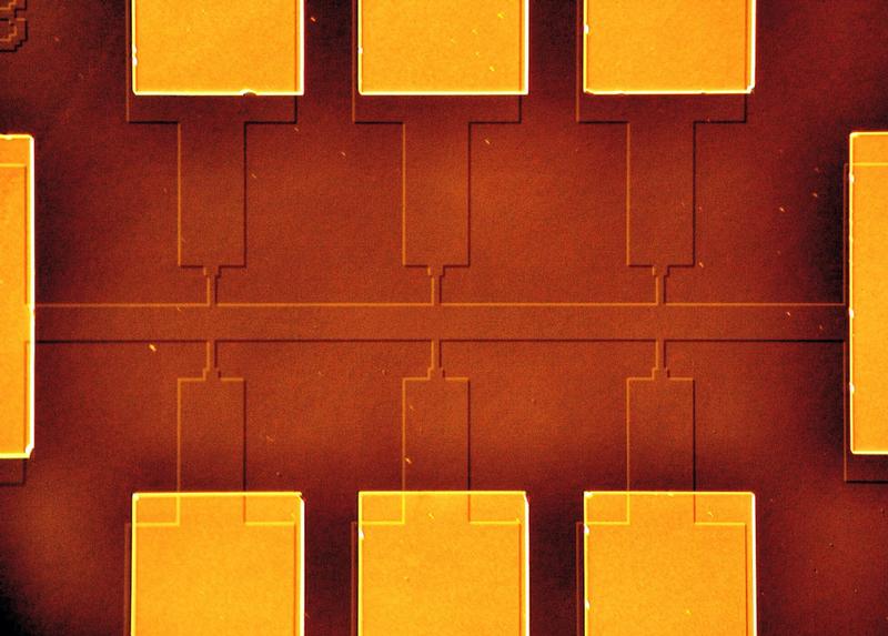 Die Goldkontakte an den Rändern der Probe sind etwa 200 Mikrometer breit. Das Elektronengas befindet sich unter den Stegen. Fotos: Thorsten Naeser