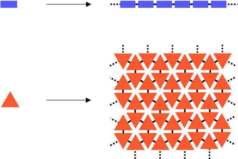 Schematische Darstellung eines linearen kettenförmigen Polymers (blaue Kästchen) und eines zweidimensionalen Polymers, bei dem sich die Monomere flächig anordnen. (orange Dreiecke). (Bild: Forschungsgruppe Schlüter / ETH Zürich) Quelle: (idw)