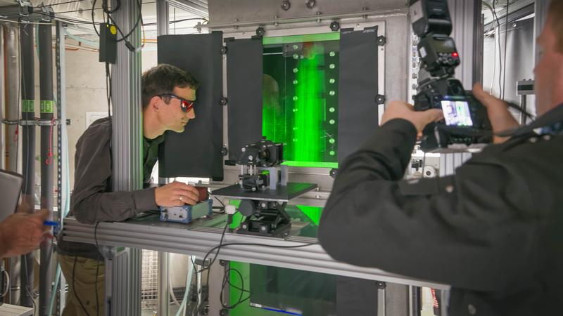 Dr. Jens Voigtländer (TROPOS) beim Messen der künstlichen Wolke im Windkanal. Der neue Windkanal ist Teil des Leipziger Wolkenlabors, in dem seit 2006 verschiedenste Wolkenprozesse simuliert werden. Quelle: Foto: Tilo Arnhold, TROPOS (idw)