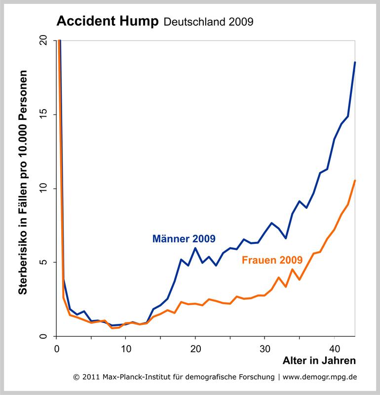 Tödliches Draufgängertum: Wenn die Produktion männlicher Hormone in der Pubertät maximal ist, steigt die Wahrscheinlichkeit eines Jungen, in Deutschland im Jahr 2009 zu sterben, von knapp unter 1 zu 10.000 mit 13 Jahren auf etwa das Sechsfache im Alter von 18 Jahren (gut 5 zu 10.000). Bild: MPIDR, Human Mortality Database www.mortality.org
