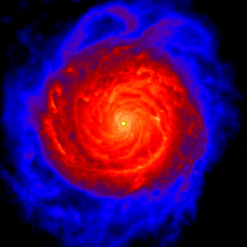 100'000 Lichtjahre später ist eine dichte Scheibe entstanden mit einer supermassiven Wolke im Zentrum. Bild: UZH