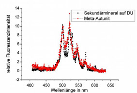Zwei Spektren übereinander gelegt: das rote Spektrum der bekannten Vergleichsprobe stimmt überraschend genau mit dem schwarzen Spektrum des Uransalzes überein. FZR
