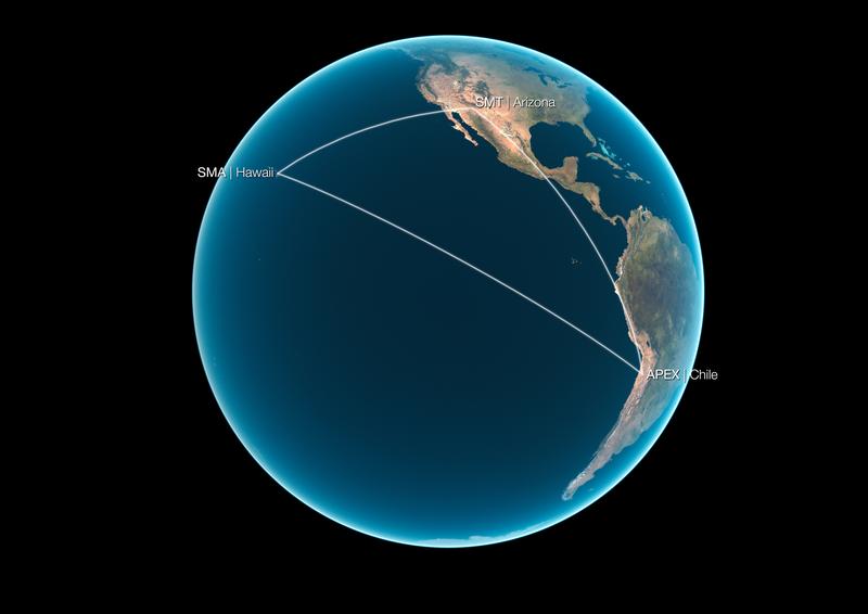 Positionen der drei an dem 1,3-mm-VLBI-Experiment beteiligten Radioteleskope: Die Basislinie zwischen Chile (APEX) und Hawaii (SMA) beträgt 9447 km, zwischen Chile und Arizona (SMT) sind es 7174 km, und zwischen Arizona und Hawaii 4627 km. Quelle: Bild: ESO/L. Calçada (idw)