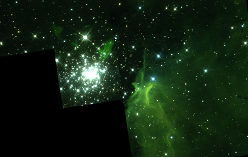 Teilansicht des gigantischen Nebels NGC 3603 (einer »HII-Region«) mit seinem zentralen, nur eine Million Jahre alten kompakten Sternhaufen. Falschfarbenbild aus Beobachtungen der »Wide Field/Planetary Camera 2« des Weltraumteleskops Hubble. Die dominante grüne Farbe zeigt dabei Licht an, das ausgesendet wird, wenn ionisierter Wasserstoff sein fehlendes Elektron zurückbekommt (»Rekombinationslinie H-Alpha«). Das Blickfeld beträgt rund 160 Bogensekunden mal 160 Bogensekunden. Die gezackte Bildstruktur ergibt sich aus der Anordnung der Detektoren der Wide Field/Planetary Camera. Bild: NASA/ESA/Wolfgang Brandner (MPIA), Boyke Rochau (MPIA) und Andrea Stolte (Universität zu Köln)