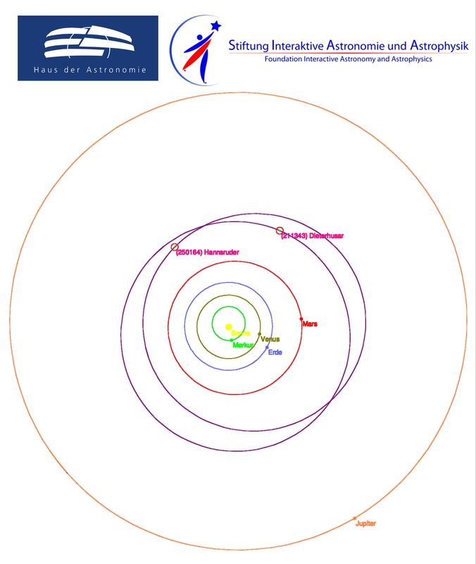 Ansicht unseres Sonnensystems bis einschließlich Jupiter von oben. Die Bahnen der beiden neu benannt Quelle: Grafik erstellt mit EasySky/Matthias Busch (idw)