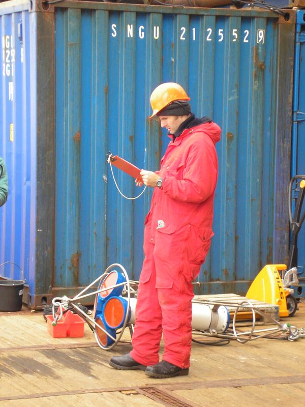 Dr. Boris Cisewski vor einem akustischen Messgerät (ADCP). Quelle: Foto: Alfred-Wegener-Institut/Volker Strass (idw)