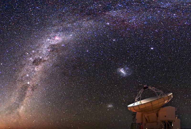 APEX und der Nachthimmel über Chile. Quelle: ESO/Y. Beletsky (Himmelsfoto); ESO (APEX-Teleskop); Bildzusammenstellung von C. Urquhart. (idw)