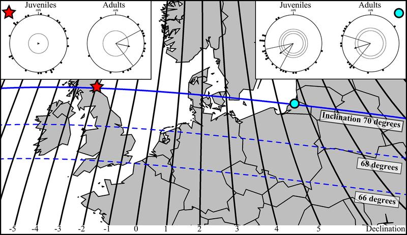 In Nordeuropa eignet sich der sogenannte Deklinationswinkel gut, um die Ost-West-Position zu bestimmen (schwarze Linien). Das Diagramm zeigt die bevorzugte Orientierung der getesten Teichrohrsänger. Quelle: Universität Oldenburg (idw)