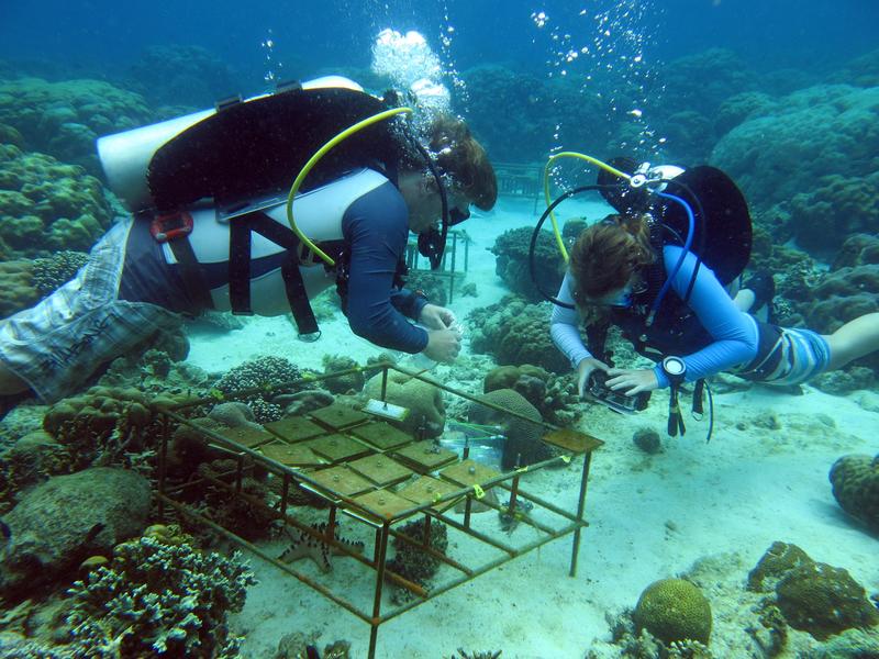 Arbeit an Siedlungsplatten für Korallenlarven, Spermonde, Indonesien Quelle: Foto: Pia Kegler, ZMT (idw)