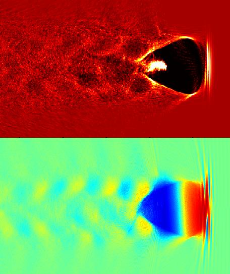 Bild oben: Visualisierung der Elektronendichte (schwarz: keine Elektronen, rot: wenige, hell: viele). Um Röntgenstrahlung mit hervorragenden Eigenschaften zu erzeugen, braucht man einen ultrakurzen und besonders dichten Elektronenpuls, wie im Bild oben dargestellt: Am rechten Rand sieht man den Laserpuls, links dahinter ein schwarzes kreisförmiges Gebiet ohne Elektronen und im hinteren Teil dieses Gebiets einen dichten Elektronenpuls. Bild unten: Darstellung der dazugehörigen elektrischen Felder, die diesen Elektronenpuls beschleunigen (grün: kein Feld, blau: negatives Feld, rot: positives Feld).