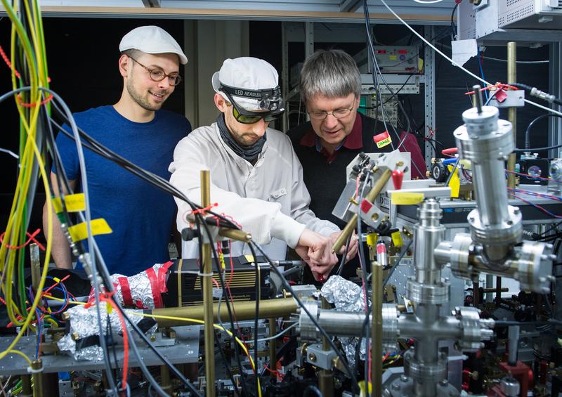 Die Messapparatur im Labor: Dr. René Reimann, Tobias Macha und Prof. Dr. Dieter Meschede vom Institut für Angewandte Physik der Universität Bonn. Quelle: (c) Foto: Volker Lannert/Uni Bonn (idw)