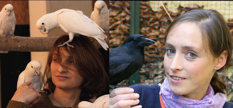 Links: Dr. Alice Auersperg; Rechts: Dr. Auguste von Bayern mit Goffin Kakdus & junger Neukaledonischer Krähe Quelle: Copyright: Julie Auersperg & Auguste von Bayern (idw)