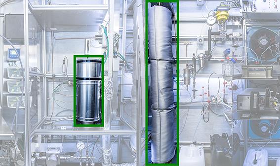 Blick in das Innere der Versuchsanlage am PSI: Mit dem Salzabscheider (links) werden die Nährsalze aus den Kaffeerückständen abgetrennt, im Reaktor (rechts) wird Methan erzeugt.Quelle: Foto: Paul Scherrer Institut/Mahir Dzambegovic (idw)