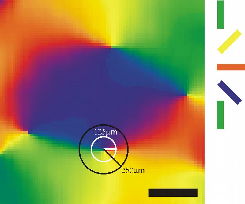 Anordnung der Zellen in der primären Sehrinde. Unterschiedliche Farben symbolisieren die bevorzugte Kantenorientierung von Zellen an der jeweiligen Position. Zellen beispielsweise in der eingekreisten Region sind mit Zellen sehr unterschiedlicher bevorzugter Orientierungen verschaltet, während Zellen in homogenen Zonen (z.B. im blauen Bereich) vor allem Eingaben von gleichartigen Zellen erhalten. Bild: K. Obermayer