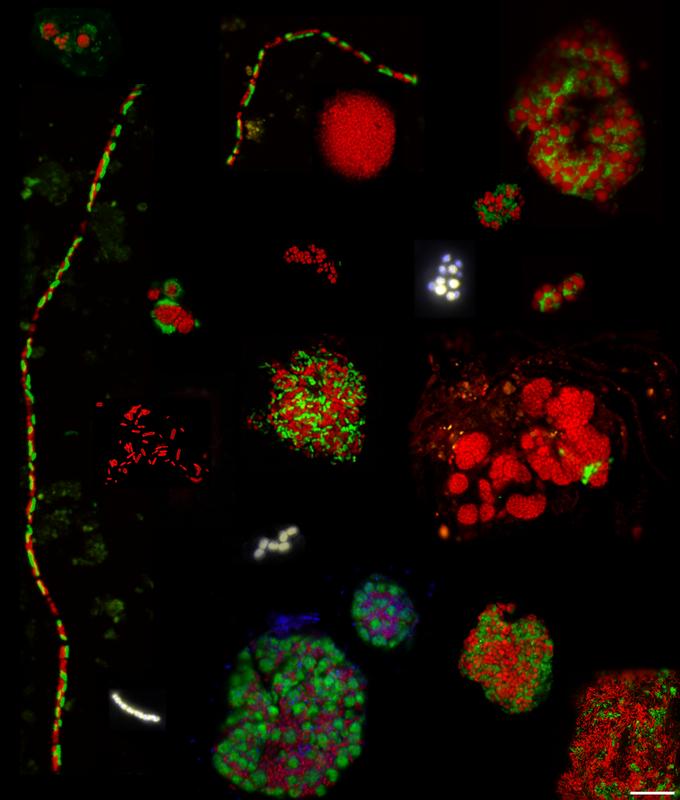 Mikroskop-Aufnahmen methanotropher Mikroorganismen verschiedener Methanquellen. Quelle: Katrin Knittel/Emil Ruff, MPI Marine Mikrobiologie, Bremen (idw)