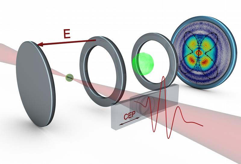 Blick in den Mikrokosmos der Kohlenstoffmoleküle: Nachdem Femtosekunden-Laserpulse aus den Kohlenstoffmolekülen einzelne Elektronen herausgelöst haben, entsteht eine charakteristische Ausrichtung der Moleküle. Diese Ausrichtung zeigt die Struktur der Orbitale aus denen die Elektronen aus den Molekül-Ionen austreten. Mit Hilfe eines Detektors lässt sich bestimmen wie die Molekül-Ionen ausgerichtet sind. Die Anzahl der beobachteten Ionen ist farblich dargestellt. Rot und Gelb lassen auf eine hohe Dichte schließen, blau auf eine niedrige. Illustration: Matthias Kling