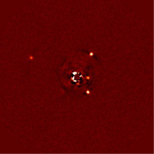 Direkte Abbildung des Planetensystems um HR8799. Links der Planet HR8799b, auf der rechten Seite, von oben nach unten, die Planeten c, e und d. Der Stern ist mithilfe einer Maske ausgeblendet. Quelle: Bild: A.-L. Maire / LBT (idw)