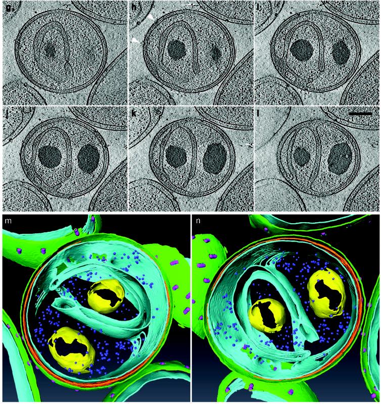 Kryo-elektronenmikroskopische Aufnahmen (oben) und 3D Rekonstruktion (unten) eines Planctomyceten mit weit ins Zellinnere ragenden Einstülpungen der Zytoplasmamebran (hellblau) Quelle: Boedecker et al. 2017, Nature Communications, doi: 10.1038/ncomms14853 (idw)