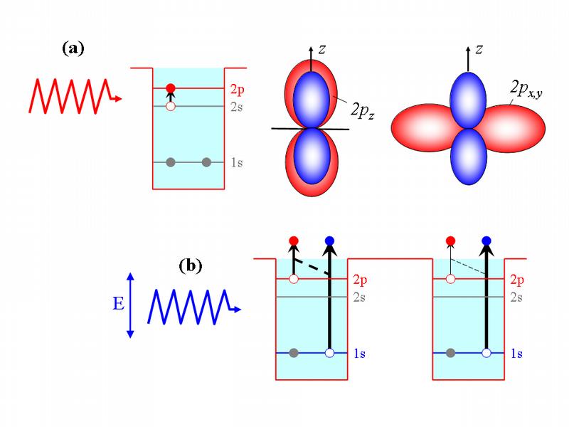 Anschauliche Darstellung der Doppelionisation von präparierten Lithiumatomen (a) durch vertikal polarisiertes UV-Licht (b). Die Wahrscheinlichkeit für die Emission des zweiten Elektrons auf der 2p-Schale hängt davon ab, ob sein Orbital (rote Keulen) parallel oder senkrecht zur Lichtpolarisation ausgerichtet ist. Bild: MPI für Kernphysik