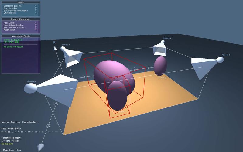 Mit Hilfe von Kamerasystemen scannt die Software »Link4Save« die Produktionshalle und kann bei kritischen Situationen Roboter sofort stoppen. Quelle: © Fraunhofer IDMT (idw)