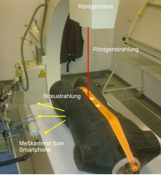 Versuchsaufbau: Mit einem C-Bogen wurde ein patientenäquivalentes Phantom mit Röntgenstrahlung durchleuchtet (roter Pfeil). Die dabei entstehende Streustrahlung (gelbe Pfeile) konnten mit einer geeichten Messkammer bzw. dem Smartphone nachgewiesen werden. Dr. Georg Stamm (Mediz. Hochschule, Institut für Diagnostische und Interventionelle Radiologie)
