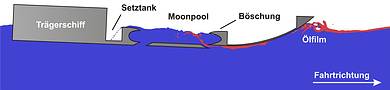 Frei fahrendes Ölskimmingsystem während einer dreiphasigen Strömungssimulation (Wasser/Luft/ Öl) in Seegang. © TU Berlin, FG Meerestechnik